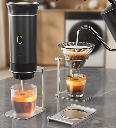 Cafetière portable 3 en 1 équipée d'une pompe chauffante électrique et d'un système de capsules sans fil. Prépare café et thé avec extraction optimale en toute situation. Parfaite pour les trajets, le bureau ou les environnements industriels, elle maintient une température stable et se transporte aisément. Technologie de pression cliniquement éprouvée garantissant une qualité de boisson constante, où que vous soyez.